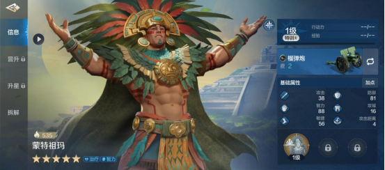 蒙特祖玛定位是智力兼智力,率领的兵种类型是远程,攻击距离为4,非常长。面板数值中上水平,初始智力为88,防御为81。