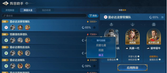 因此,搭配方面主要分为两种,一种是追求爆发,首推秦始皇为首的智力控制队,控制不仅能增加伤害还能控制对手,爆发力十足。第二种是以雷必达为首的续航队,队伍中也有控制,只是不像前者那么密集,更多是用续航增加输出频率以提升“月望七星”的综合伤害。