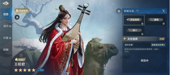 《世界启元》中,王昭君是只能给女性英雄提供辅助能力的英雄,因此搭配全女性阵容对其非常重要,而搭配限制所带来是其非常强力的控制能力。