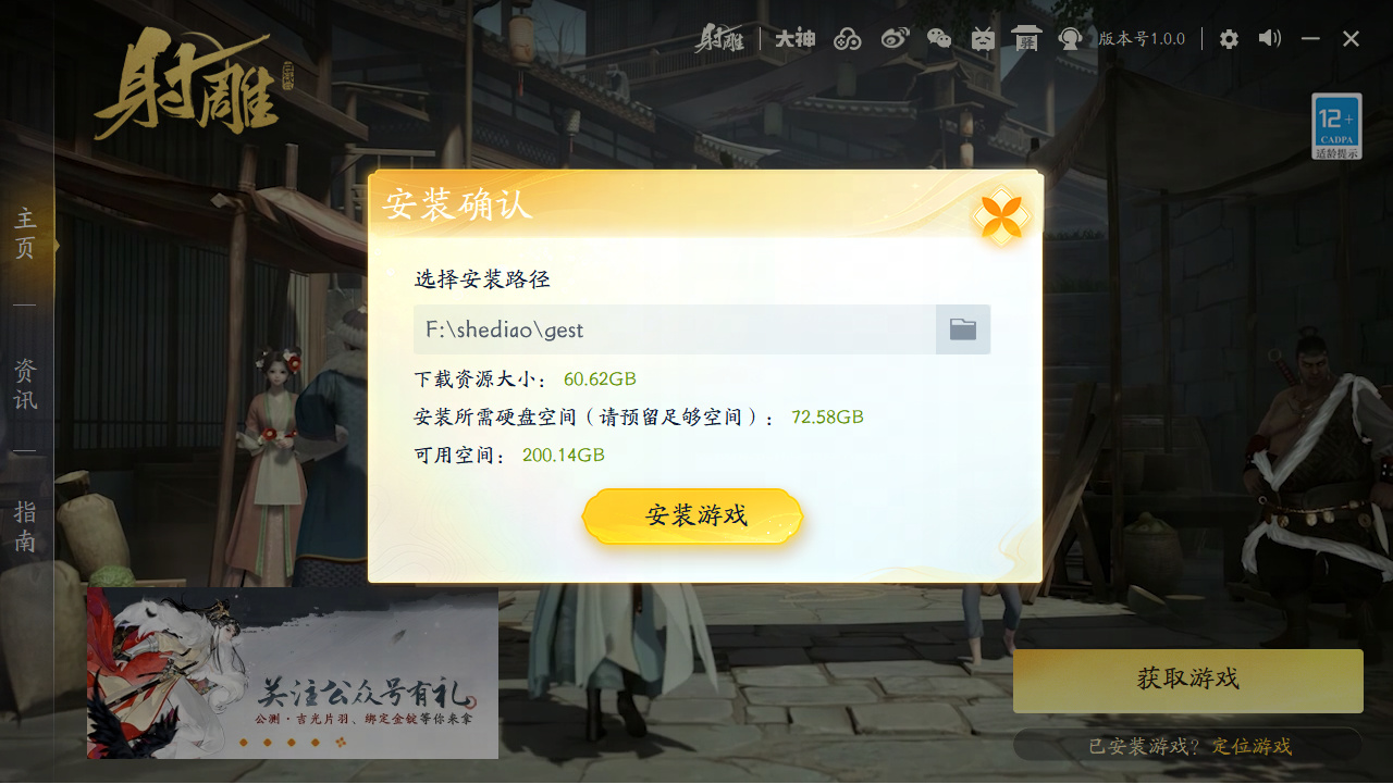 第三步:启动器安装完成&更新到最新后,进入下载游戏阶段。点击“获取游戏”按钮。