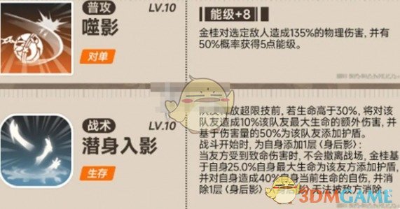 3、金桂的的核心生存技能是全队护盾,辅助技能在队友处于护盾状态下即可生效。