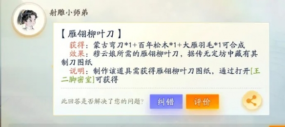 2、材料一:雁翎柳叶刀,在王二脚店密室获取,王二脚店密室进入方法。