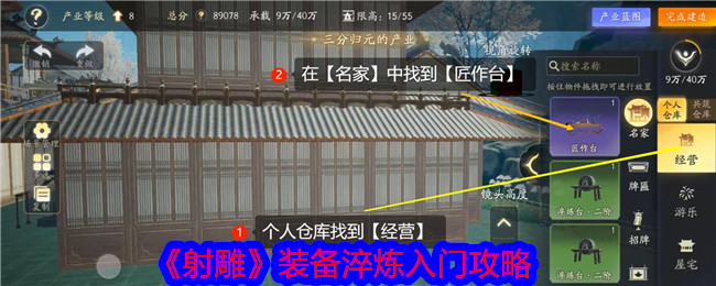 产业方面的先决条件就是有自己的房子,拥有房子后,我们会得到赠送的【匠作台】,然后就是淬炼用的【锻炉】获取和放置,步骤如下图
