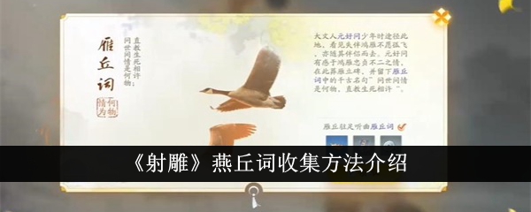 射雕燕丘词怎么收集?我们需要前往到指定的位置,进行聆听之后就能成功的收集到了,很多的小伙伴还不知道怎么去进行收集,所以下面就是小编整理好的详细的收集方法,还不知道怎么收集的小伙伴,就不要错过此内容。