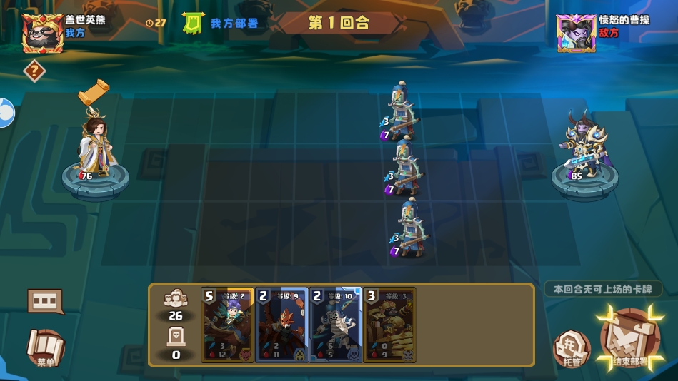 随机登场的许褚也是另一大威胁,尤其是新人自强组队的时候,卡牌等级偏低,许褚的死咒威胁还是很大的。因此手上一定要留好技能针对好许褚,千万不要让它在场上停留时间太久。敌方的许褚是3级的,死后骨堆是4点血,所以一定要计算好伤害一波带走,别让他复活。如果有甘宁在场,或者由阴阳师,或者道圣的天罚击杀可以无视他的复活效果。