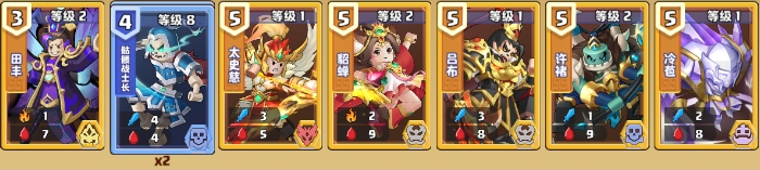 紫卡(3-4级):马岱(第四回合固定出一个),小乔,孙韶,