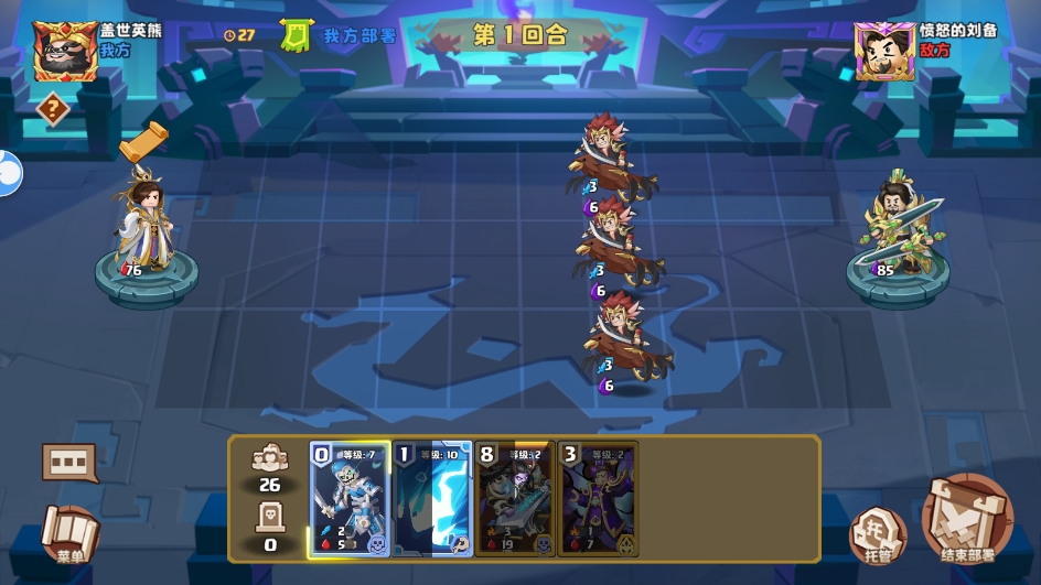 因为有些困难本出怪很快,我们尽量尝试用1个单位守住一路,我们把自己有限的兵力集中去进攻另外两路。太史慈,冷苞,曹仁,炫彩甲虫,都是不错的选择。