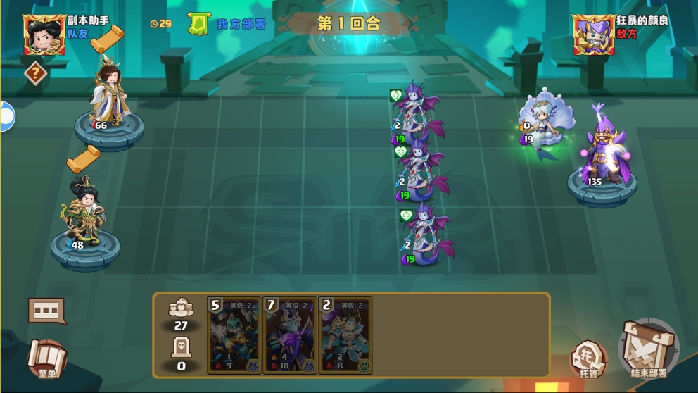 1. 开局有两种处理思路,一是放前三只怪贴脸,先解决后面的怪,回头慢慢打,因为他们三只怪伤害不高,可以这么做。二是顶住1-3路击杀,取决于起手双方的卡牌情况。因为这三只娜迦亲卫是带反击和中毒效果的,一般的卡很难顶住,包括骷髅都不好使,经常被反伤死之后对方回合就直接带走。因此最好等第二回合看对方后面刷的是什么怪。如果一路只有物理输出的就可以用重甲单位顶住,如果后排刷的是鱼人学者,就很难顶,除非有道圣配合护甲符或者法抗符,如果没有建议开绿色通道让娜迦亲卫贴脸,然后先解决后面的怪,然后让警戒单位或者关羽清理贴脸的娜迦亲卫。