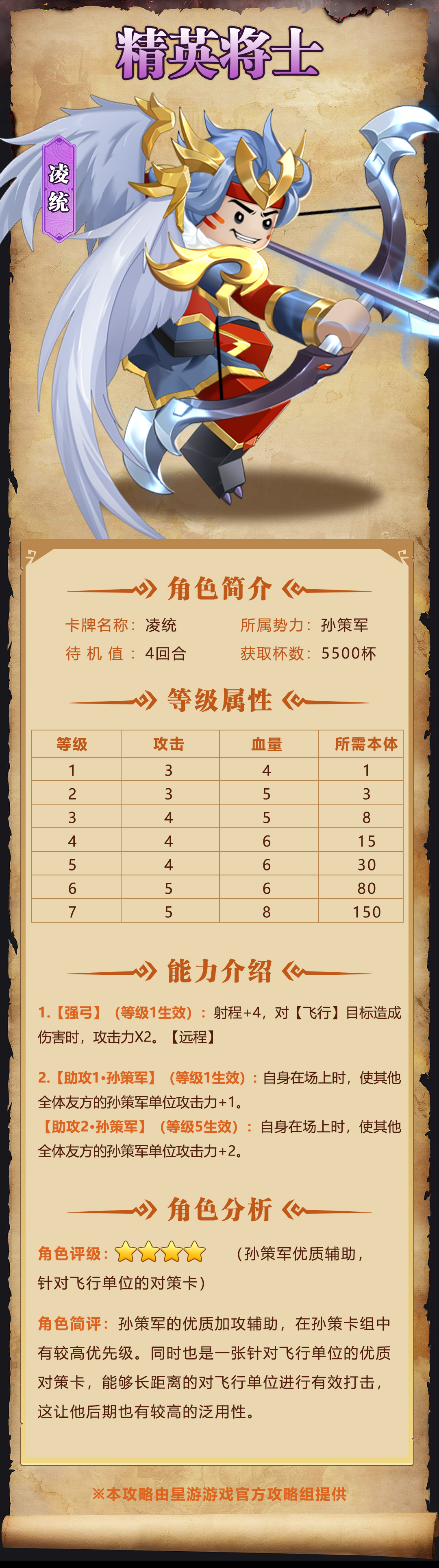 角色评级:4星(孙策军优质辅助,针对飞行单位的对策卡)