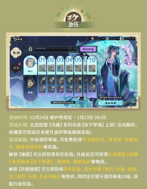 活动介绍:五弦琵琶【闲趣】系列衣装【伞下琴语】上新! 活动期间,收藏家可完成任务提升游历等级解锁奖励。