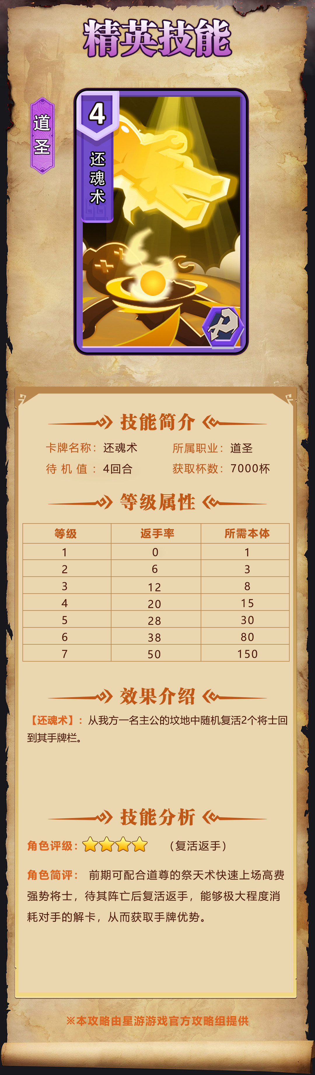 前期可配合道尊的祭天术快速上场高费强势将士,待其阵亡后复活返手,能够极大程度消耗对手的解卡,从而获取手牌优势。