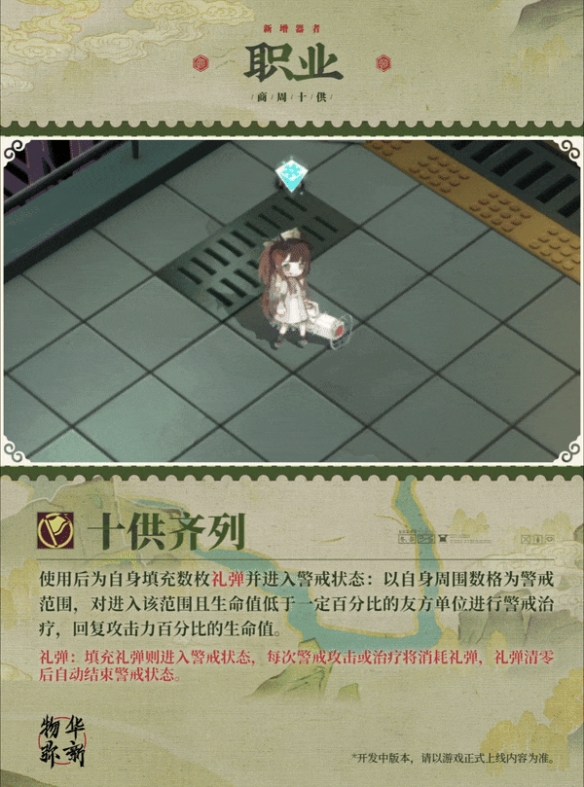 十供齐列(职业):使用后为自身填充数枚礼弹并进入警戒状态:以自身周围数格为警戒范围,对进入该范围且生命值低于一定百分比的友方单位进行警戒治疗,回复攻击力百分比的生命值。