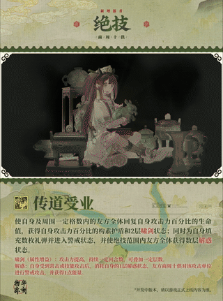 为人师表:使用绝技时,使自身获得1层师恩状态,同时使周围一定格数内的友方全体获得1层学海无涯状态。