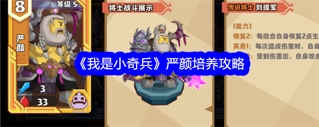 今天给大家带来了《我是小奇兵》严颜培养攻略。严颜是待机值为8的近战将士,每位主公都可以在第一次的“在线奖励”中,在线2小时获得严颜,天梯所有分段的宝箱中也都有概率能开到。在0-3000分段中,主流的传说将士较少,严颜的战斗力能碾压绝大多数普通将士,是各位主公上分必备的大哥。