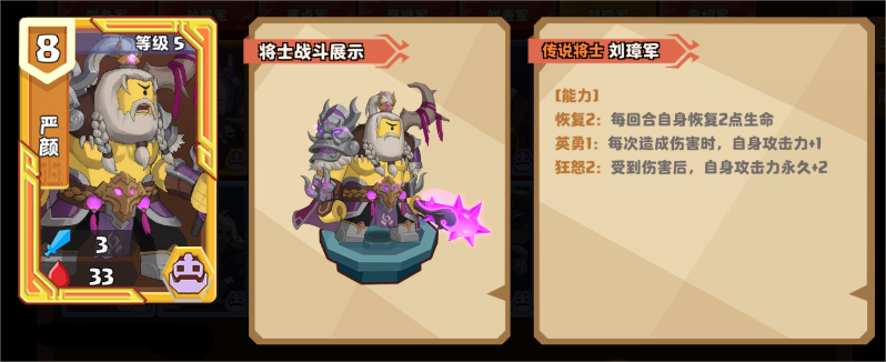 2.严颜的能力【英勇1】:每次造成伤害时,自身攻击力+1;【狂怒1】:受到伤害后,自身攻击力永久+1;当严颜等级提升到3级后,解锁能力【狂怒2】:受到伤害后,自身攻击力永久+2。