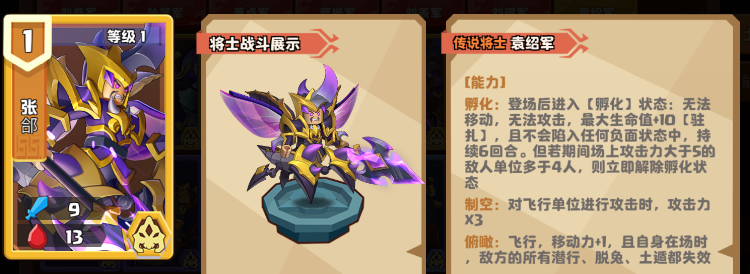 能力【孵化】:登场后进入【孵化】状态:无法移动,无法攻击,最大生命值+10【驻扎】,且不会陷入任何负面状态中,持续6回合。但若期间场上攻击力大于5的敌人单位多于4人,则立即解除孵化状态。