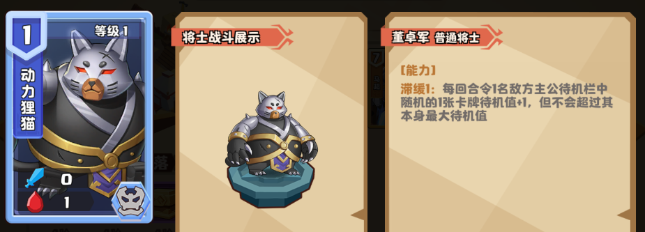 作为早期唯一的拥有【滞缓】能力的将士,动力狸猫不仅费用低廉,可以一回合登录战场,还可以为敌方主公待机栏中的一张卡牌待机值+1。实际战斗时,狸猫很可能会增加敌方待机栏中具备【警戒】的将士待机值,使其无法及时登场对孙策造成伤害。待孙策召唤的羽灵填满战场时,拥有【警戒】的将士无法对孙策造成威胁了。