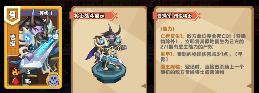 4级的曹操,能力【亡者复生1】会升级为【亡者复生2】,可以召唤出更强力的3/2尸奴。