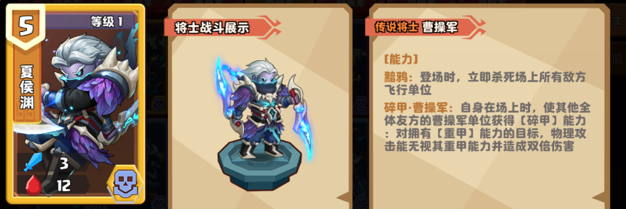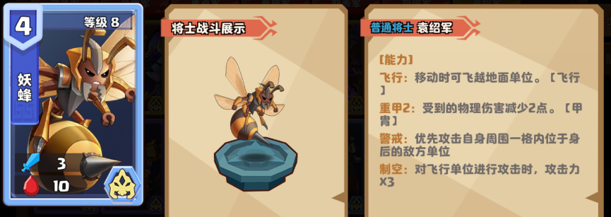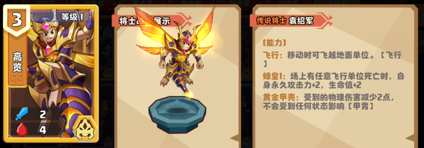 1.高览的独特能力【蜂皇1】:场上有任意飞行单位死亡时,自身永久攻击力+2,生命值+2。高览无限膨胀的力量来源,他在战场中可以跟随飞行骑乘将士,等待前方将士白给后获得属性提升,为他们报仇。
