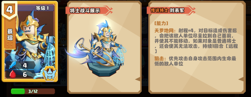 蔡瑁的能力【天罗地网】:射程+4,对目标造成伤害后,会把该敌人单位尽量拉到自己面前,并使其不能移动,如果对象是普通将士,还会使其无法攻击,持续1回合【远程】。这个能力给予蔡瑁拥有小奇兵世界中最远的攻击距离,他仅需前进2步就能直接狙击敌方主公。而且攻击普通将士时,能完封将士的移动与攻击动作。无论敌方普通将士等级多高,只要与蔡瑁站一条线上,照样给你一网子拿下。