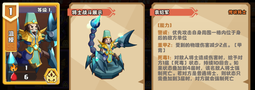 【死毒】状态无法作用到这两个将士身上,且这两个将士都能对沮授造成威胁,不仅能单防沮授,还能造成较多伤害。(PS:无视状态异常的高览,冷苞,许褚,骷髅斗士,虽然能不受死毒的影响,但是不能较好的威胁到具有【重甲】的沮授,所以并不能算是克制将士~
