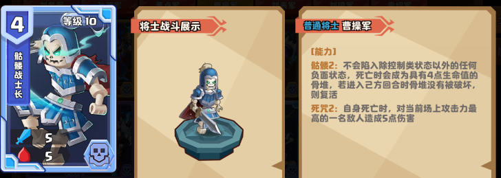 2.许褚的能力【骷髅1】:不会陷入除控制类状态以外的任何负面状态,死亡时会成为具有1点生命值的骨堆,若进入己方回合时骨堆没有被破坏,则复活。
