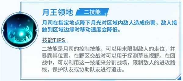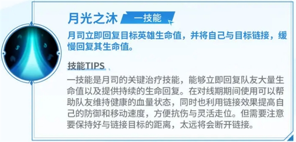 4级后的月司有很强的团队恢复能力,可以大量恢复已方英雄的生命值,在团战中相当于第二条命,中期多跟团,注意已方关键输出位的位置,使用1技能和大招为其提供续航和保护。