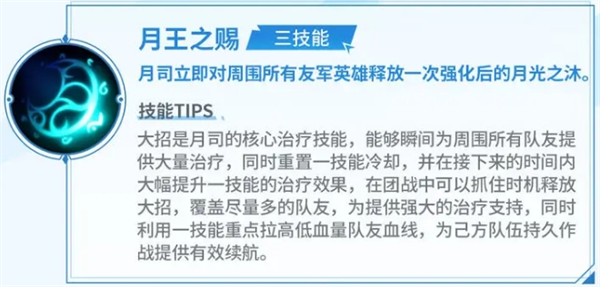 团战开始前,优先使用二技能范围减速限制敌人站位并破除敌人的隐形效果,方便追击与保持视野,再使用一技能链接已方核心输出位并提供治疗,当团战爆发时,注意自身站位,开启三技能覆盖更多队友,提供大量治疗支持,随后根据战场变化灵活使用一技能为受伤严重的队友提供紧急治疗。