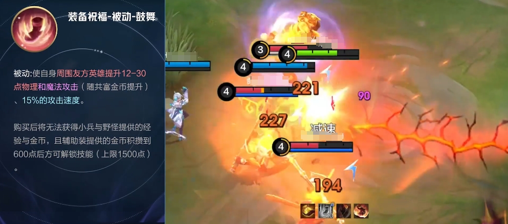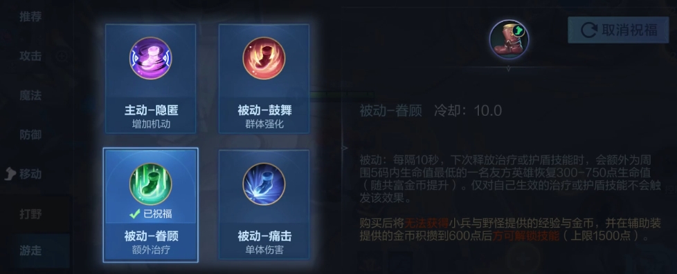 目前共有四种不同的游走祝福供玩家选择,第一个是被动-鼓舞,当装备了这件特殊物品后,持有者周围的所有友军都会享受到显著的属性加成。具体来说,每位队友都将获得额外12至30点,这一点是取决于共富金币数量的,带来的效果是物理及魔法攻击力提升,并且攻击速度也会增加15%,值得注意的是,一旦选择了这种类型的祝福,那么该角色将不再能通过击杀小兵或野怪来获取经验和金钱,同时,只有当辅助装备累积到600枚金币时才能解锁相关技能,上限为1500枚。