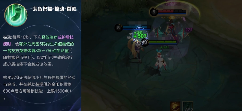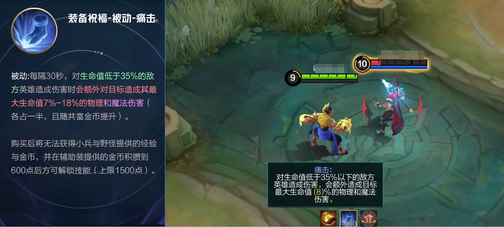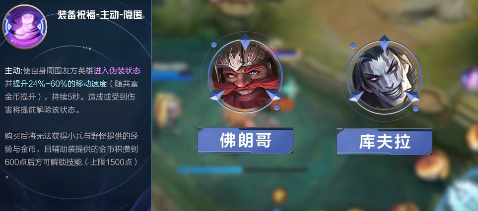 另外一个是主动-隐匿的祝福效果,激活此技能可以让施法者及其附近的盟友暂时处于隐形状态,并在此期间内提高24%至60%的移动速度,具体数值依据当前持有的共富金币数决定,持续时间长达五秒钟,如果在隐身期间受到了任何形式的伤害或者对敌人造成了伤害,则这个效果会立即消失,同样地,为了使用这项强大的能力,玩家必须牺牲掉常规的资源获取途径,直到积累了足够多的辅助专用货币,至少需要600个单位才能开启第一个阶段的能力,最多可以储存达到1500个。