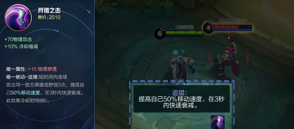 狩猎之击:这也是一件以增强攻击力为主的装备,标价2100金币,除了基础的80点攻击力外,它还减少了10%的所有技能冷却时间,值得注意的是,该物品还赋予了穿戴者额外的15%物理穿透力,当用户连续快速攻击同一个单位达到五次或者消灭任意野怪五次之后,将会暂时性地让自己的移动速度加快50%,这就意味着,在激烈的对抗过程中,灵活运用此装备可以帮助玩家更快地调整位置躲避敌方攻势或是追击逃跑的对手。