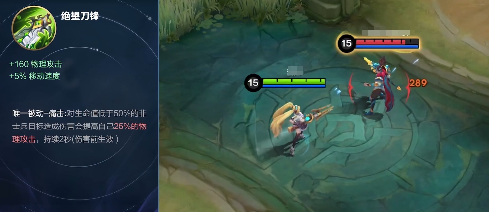绝望刀锋:这是一把极其强力的武器,价值高达3010金币,它提供了160点高额的基础攻击力以及5%的移动速度加成,更吸引人的地方在于它的被动效果,痛击效果就是当大家面对生命值不足自身一半的敌人时,此时的普通攻击将会造成额外的25%伤害,这一特性非常适合擅长收割残局或是喜欢偷袭脆皮对手的玩家使用。
