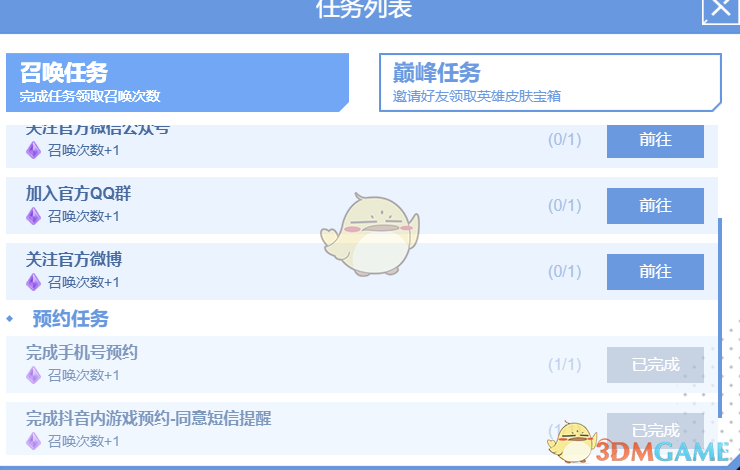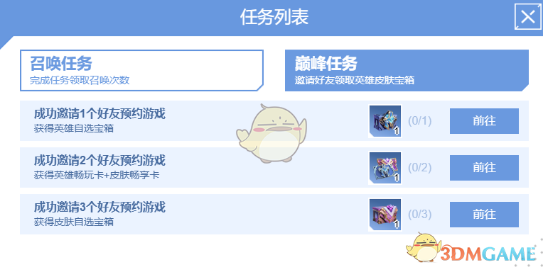 3、或者点击任务列表的巅峰任务,完成邀请好友预约的任务也能领取到英雄皮肤宝箱。