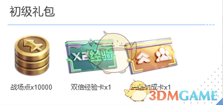 初级礼包:战场点x10000、双倍经验卡x1、队伍加成卡x1