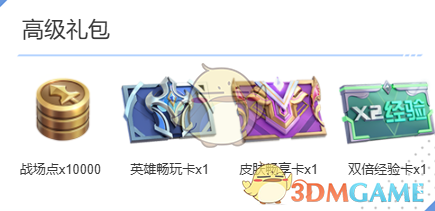 高级礼包:战场点x10000、英雄畅玩卡x1、皮肤畅享卡x1、双倍经验卡x1
