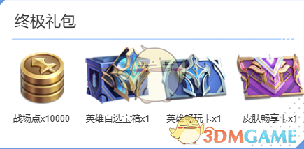 终极礼包:战场点x10000、英雄畅玩卡x1、皮肤畅享卡x1、英雄自选宝箱x1