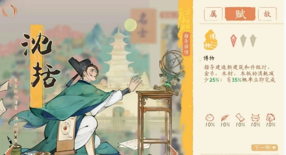 淡墨水云乡沈括怎么样?通过他的技能,玩家可以大幅度减少建造过程中所需金币、木材和木板的消耗,同时具有一定的概率立即完成建造任务,这对于游戏中的资源管理和任务规划显得尤为重要。