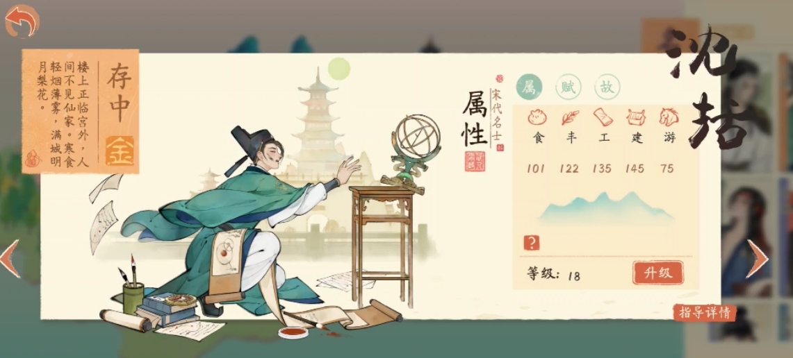 沈括的角色属性被设定为“工”与“建”,这一属性反映了沈括现实生活中对工程建筑方面的贡献。在游戏里,这意味着沈括特别擅长处理与建筑和工程相关的事宜,能够在这些领域展现出非凡的能力。