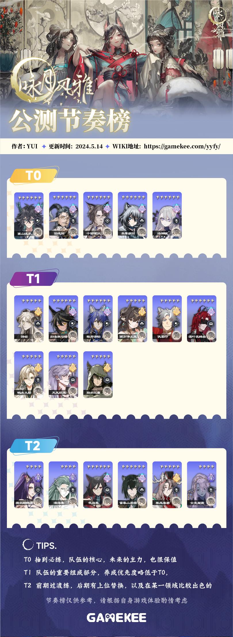 咏月风雅游戏是一款二次元国风卡牌养成游戏!游戏中有很多精美的角色登场,每一笔都是翰墨纵横。游戏今日公测上线,GamekeeWiki咏月风雅“YUI”为大家带来了《咏月风雅》公测节奏榜分享,一起来看看吧!