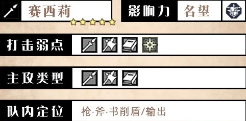 继赛拉斯之后第二位拥有3打击面aoe的角色,被动增伤相似,用法也几乎一致。但是白值比赛拉斯差了太多,导致她的输出会低一些,贵在斧与书这两种的3连a0e比较珍贵。而商人职特色的BP传递技能让她会拥有一些额外的辅助能力。自身被动有开局BP+1效果,在极短轴的发挥中有一些用处。对于赛西莉,不得不提的是她在日后开放的新养成系统中会拥有飞升般的加强,因此这也是一位未来前景极好的角色。
