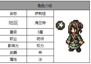 《歧路旅人:大陆的霸者》游戏中有着许多的特殊角色,其中萨莉娅是一个三星的辅助角色,使用技能可以对敌人造成伤害并恢复友军生命值,提高友军的抗性,下面一起来看看萨莉娅这个角色的具体信息吧。