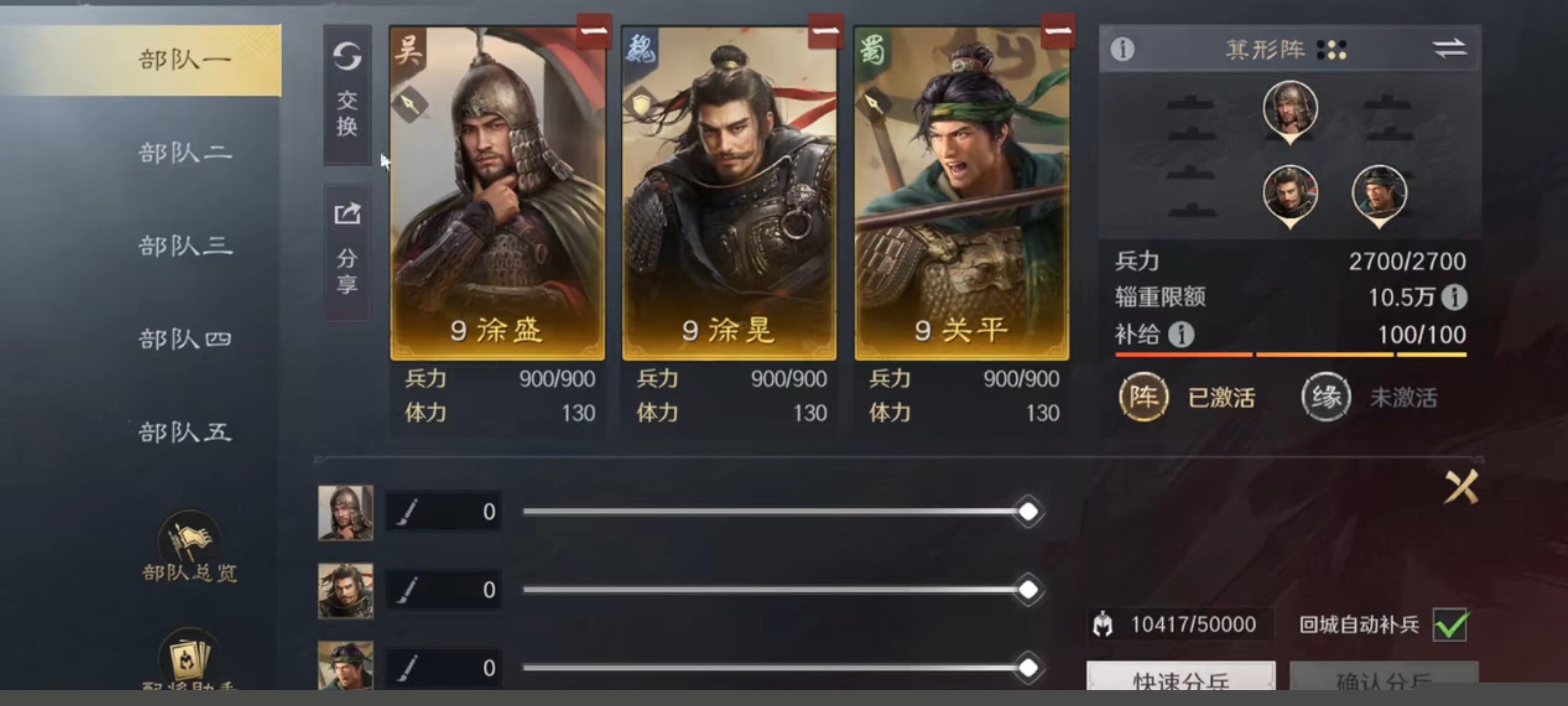 攻防一体,徐盛和孙策输出强力,大乔辅助增益,适合持续战斗,新手容易凑齐,开荒打架都好用 。