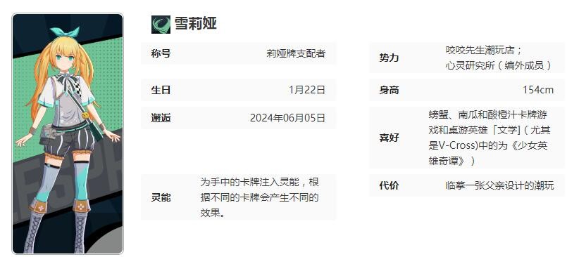 《飞跃虹镜》是一款结合了二次元美学与都市冒险元素的竖版格斗手游,游戏雪莉娅称号莉娅牌支配者。这个角色技能怎么样呢?下面是小编给大家带来的《飞跃虹镜》雪莉娅角色图鉴,感兴趣的小伙伴们一起来看看吧。