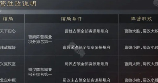 三国谋定天下S8赛季霸业结算规则是什么,游戏正式开启S8隆中对赛季,本赛季同样会分为2个阵营:曹魏和蜀汉。本赛季一共有4种结局,最终胜利的阵营可以获得专属头像框。下面就为大家解释一下S8赛季霸业结算规则吧。