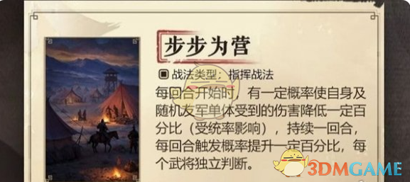 每回合开始时,有一定概率使自身及随机友军单体受到的伤害降低一定百分比(受统率影响),持续一回合,每回合触发概率提升一定百分比,每个武将独立判断。