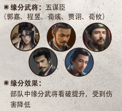 缘分效果:部队中缘分武将看破提升,受到伤害降低