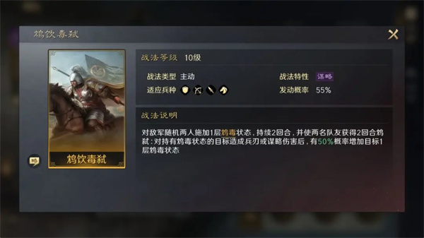 【鸩饮毒弑】主动战法,对敌方两人造成伤害并附加“鸩毒”状态,友军获得属性能力。