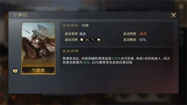 【弓腰姬】,追击战法,有概率优先攻击后排目标造成兵刃伤害,敌军异性武将越多伤害越高。