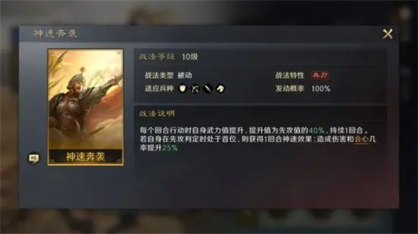 【神速奔袭】被动战法,先攻越高武力值越高,战斗时自身处于首位额外增加伤害和会心。