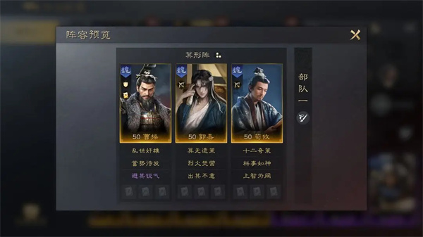 【乱世奸雄】:指挥战法,给全队减伤获得“倒戈”和“攻心”效果,统率最高单体受到伤害有概率恢复自身兵力。
